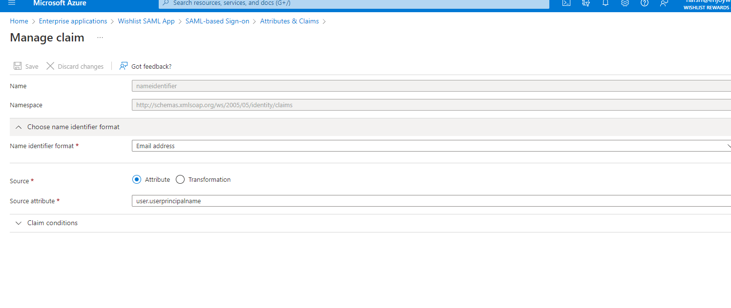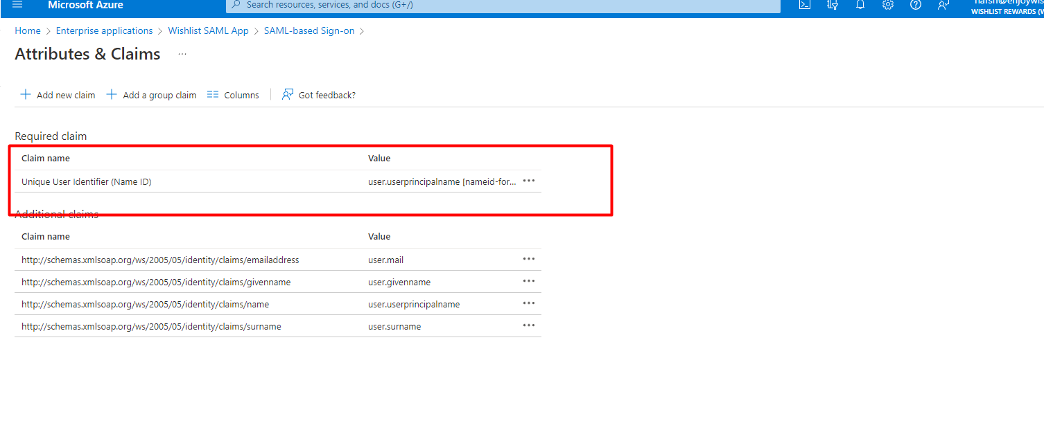 i. Under the claims section check for required claims. Make sure there is a claim Unique User Identifier (Name ID) as user.userprincipalname, with nameid-format as emailAddress.