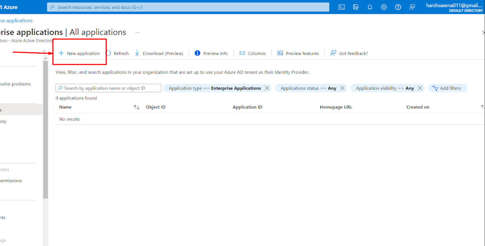 c. The “New Application” button is selected to create a new enterprise application. Click on “New Application”.