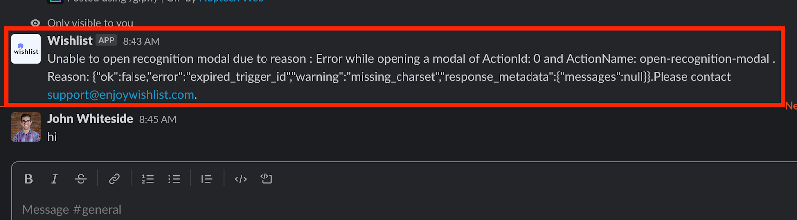 If you’re receiving an “unable to open recognition modal” error message when using the /recognize command in Slack, please follow the following steps below: