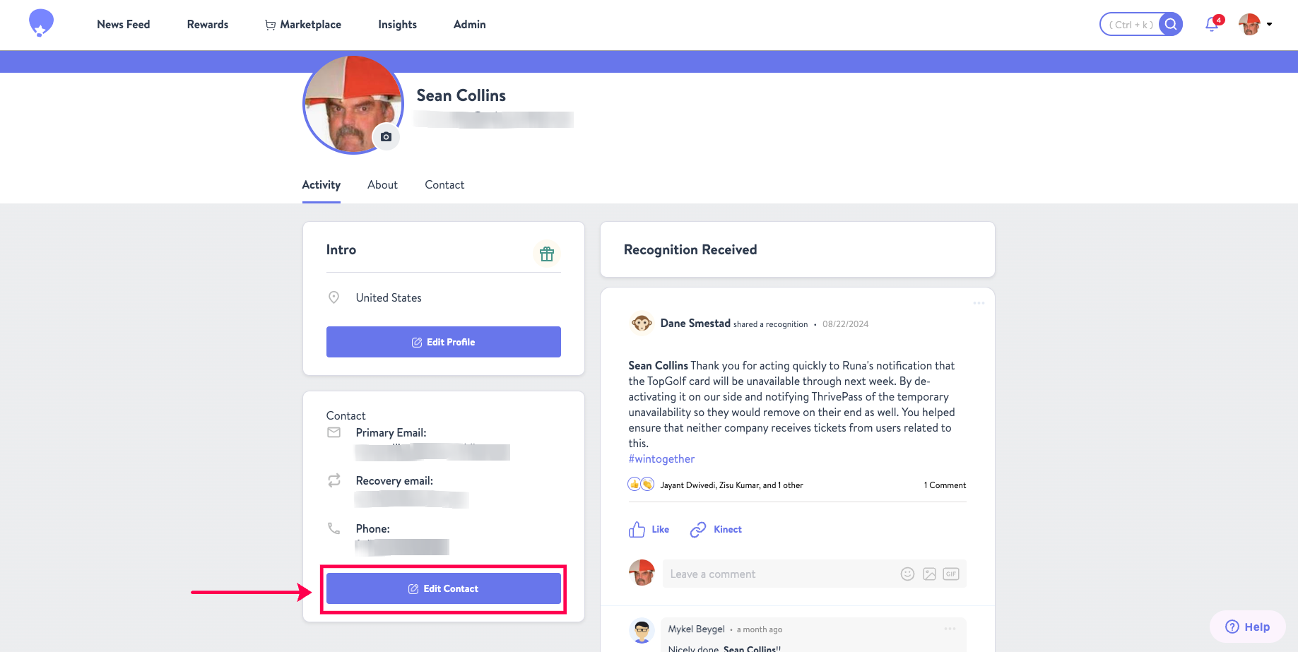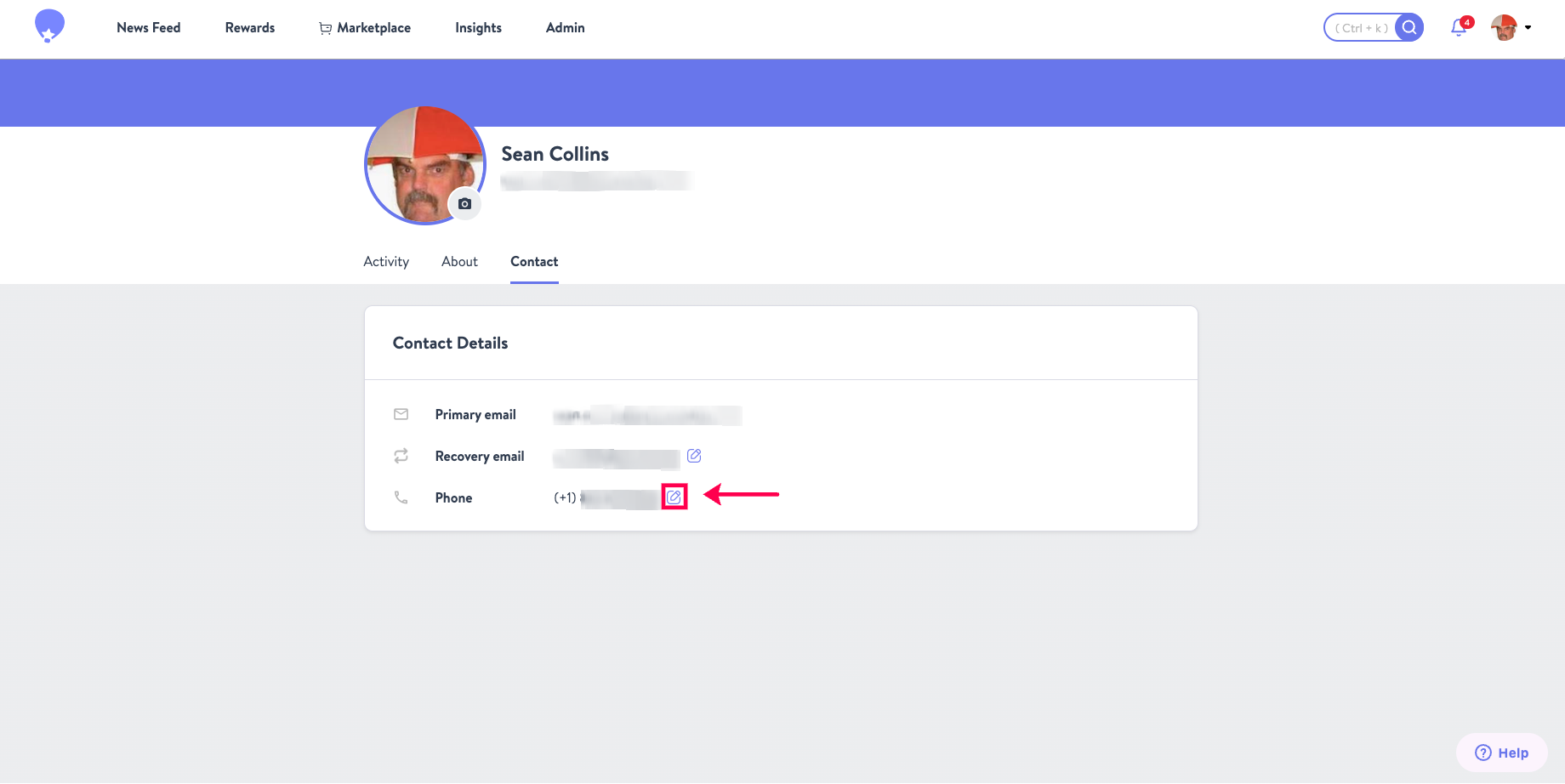 - Viewing your profile, there will be a "Contact" table listing your Primary Email, your Recovery Email, and a Phone Number. If you have not added a phone number, this space will be blank. To add your phone number, click on the "Edit Contact" button outlined in the screenshot provided below.
