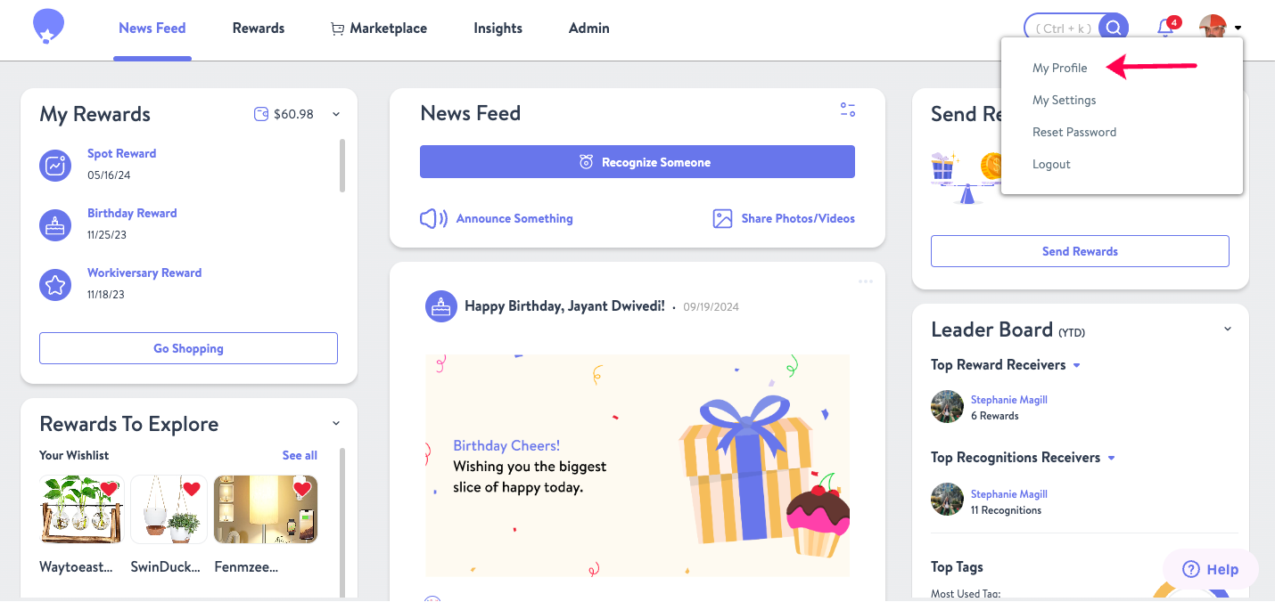 - This will provide a drop-down menu of options. You will want to select "My Profile" from this menu.