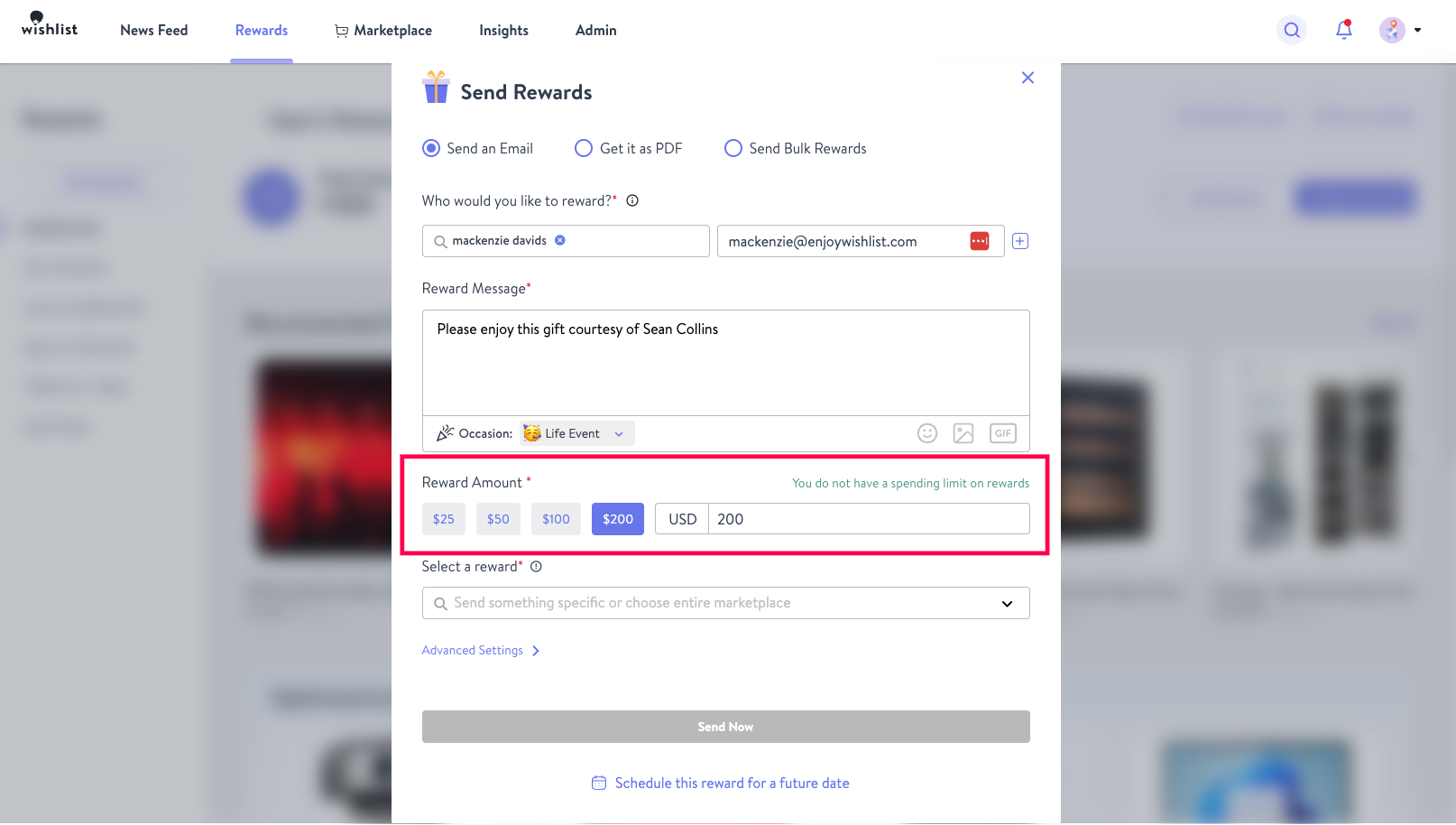 - Here, you can click Advanced Settings to add Reward Tags/Business Goals, insert an External ID & Internal Notes, or even Schedule this reward for a future date. These are all optional and you can send the reward when you're ready by clicking Send Reward! Please note that if you decide to schedule the reward for a later date, you will still need to click send reward to complete the process.