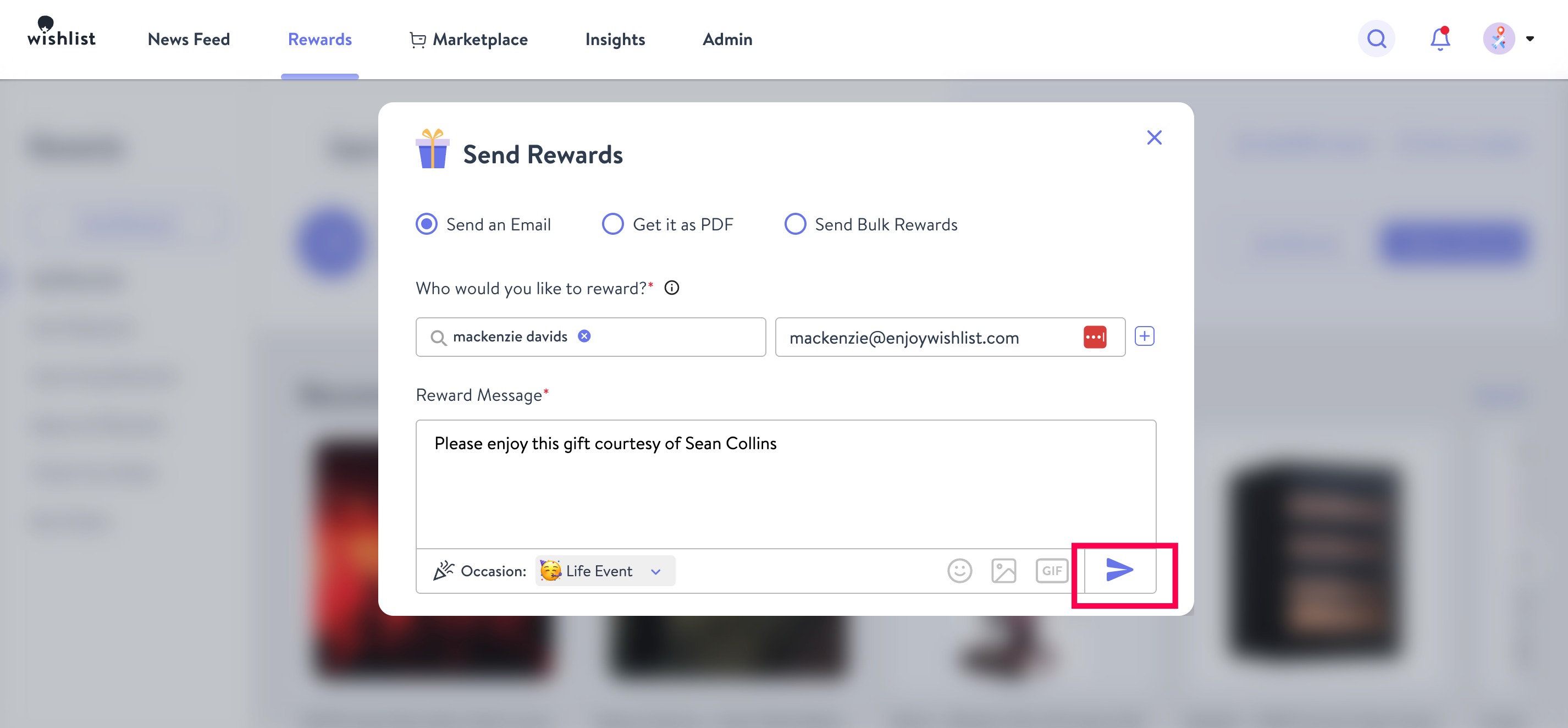- Customize a Reward Message or stick with the one that populates. You can even select an Occasion! Once done, click that little Paper Airplane to proceed.