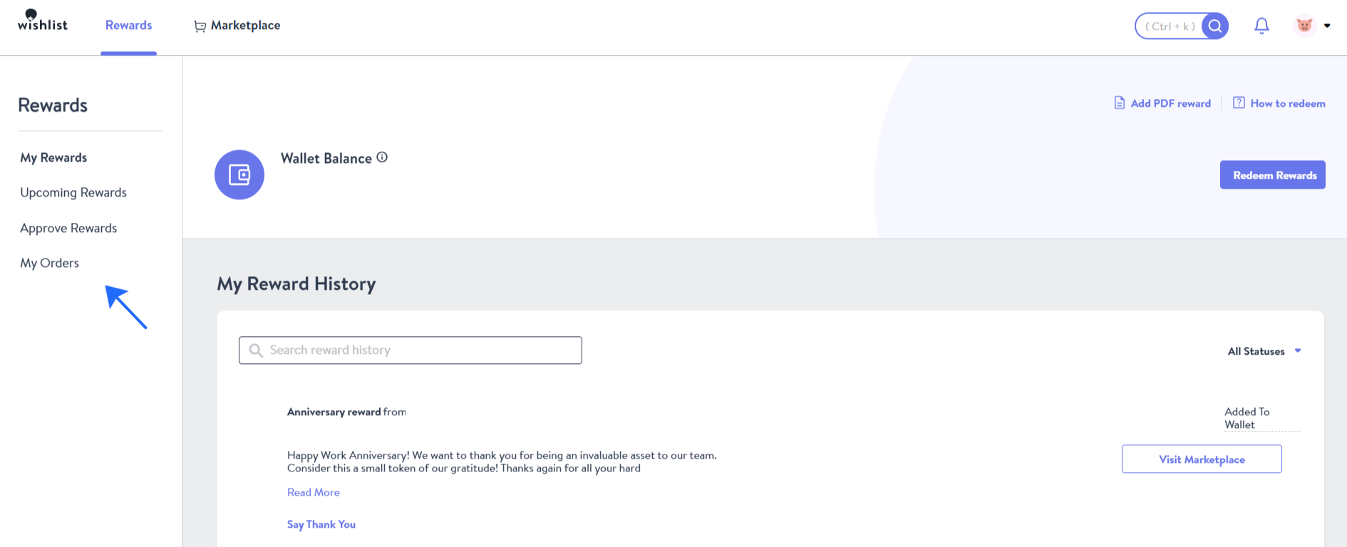 From the My Rewards section of the Rewards tab, select Rewards Received followed by My Orders
