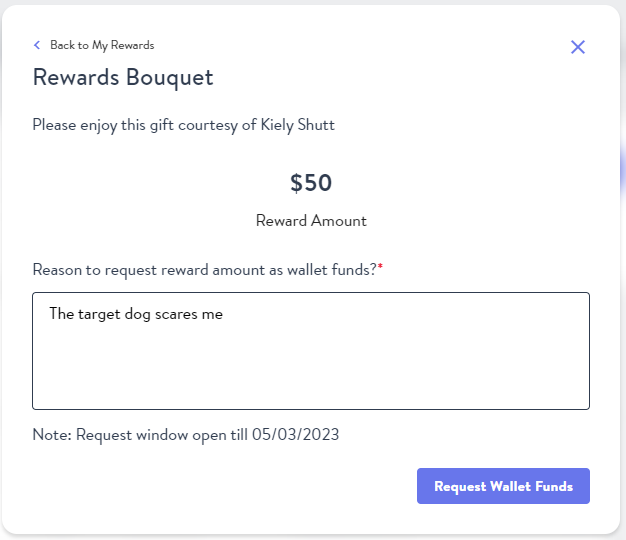 5. If “Request Wallet Funds” is selected, you will need to specify a reason why you would like to receive the full reward amount as a wallet deposit: